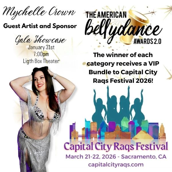 Capital City Raqs is a proud sponsor of The American Bellydance Awards 2.0 in San Diego, CA! Mychelle Crown will be awarding a VIP All-Access Capital City Raqs 2026 Bundle to the winner of each ABA category! Join Mychelle in beautiful San Diego Jan 31 - Feb 1, 2026 for an incredible weekend of dance featuring a workshop by Capital City Raqs Featured Performer Sultana!