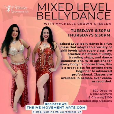 Multi-award winning artist Mychelle Crown, Owner, and Iselda Dance Design, Studio Manager, work with many accomplished, award winning belly dance artists to create a thriving dance community. We are an inclusive dance studio dedicated to honoring the beautiful cultures who created and uphold this art. Thrive Movement Arts is home for Bellydance in Sacramento, CA!
