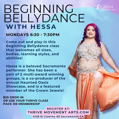 We are so excited to welcome Hessa into our Thrive family! Hessa will teach Beginning Bellydance, Modays at 6:30pm! This class will cover technique, combinations, modifications for every body type and need. All skill levels, sizes, learning styles, and tissue issues welcome!